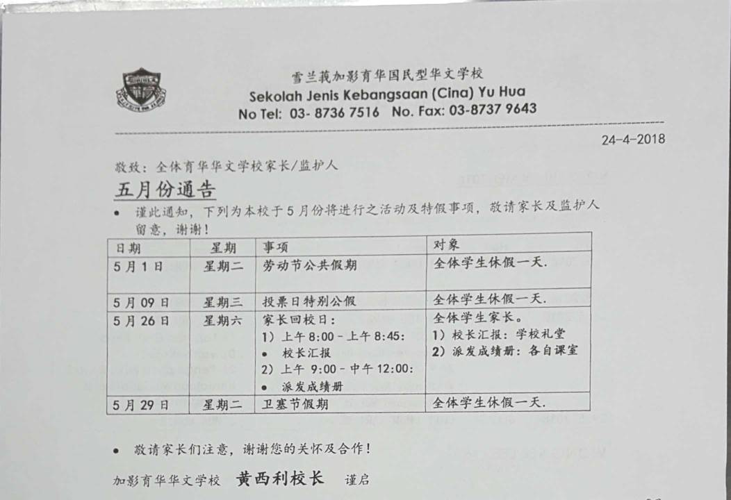 五月份通告 Notis Bulan Mei 2018