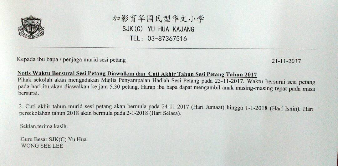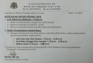 NOTIS BULAN JUN SESI PETANG 下午班六月份通告